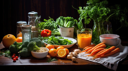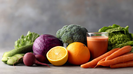 A vibrant assortment of fresh vegetables, fruits, and a glass of orange juice on a rustic table. Perfect for healthy eating, organic, and lifestyle themes.