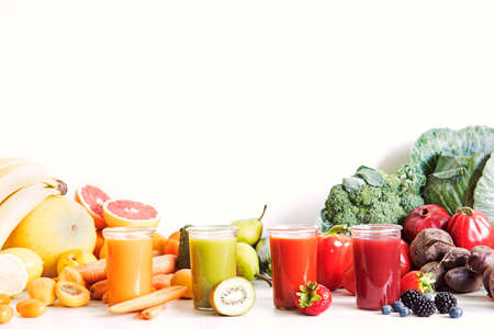 Composition of healthy colorful vegetable juices and smoothies with chia and flax seeds in glass bottles, set vegetables and fruits on the white background, copy space