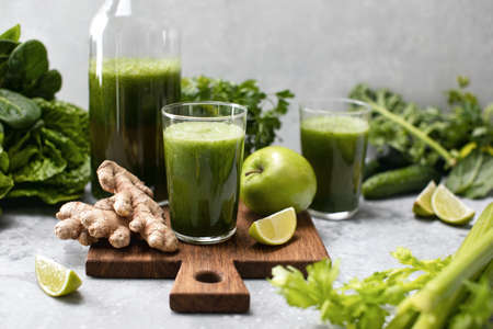 Green detox smoothies with fresh leafy vegetables and ginger, front view