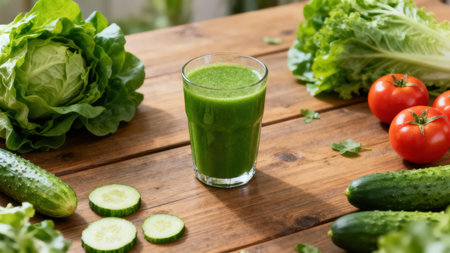 Glass of vibrant green smoothie is featured on a wooden table, accompanied by fresh cucumbers, lettuce, and tomatoes. The image showcases a healthy and refreshing meal.
