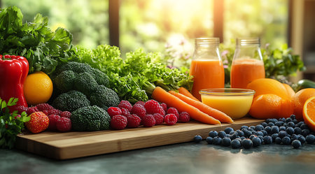 Vibrant assortment of fresh fruits and vegetables arranged on a wooden surface in a sunlit kitchen. Colorful produce includes leafy greens, bright oranges, and juicy berries, promoting healthy eating.