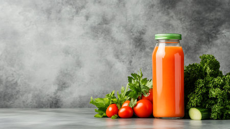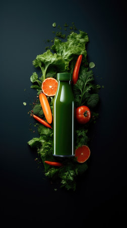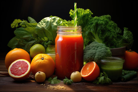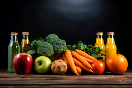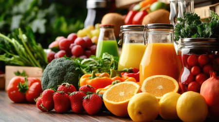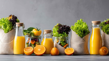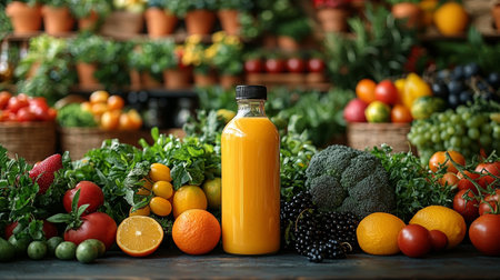 A vibrant display of fresh juices and healthy vegetables arranged with bright citrus fruits. Perfect for promoting wellness, nutrition, and healthy living.