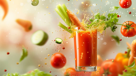A refreshing vegetable juice splash with celery, tomatoes, and various veggies flying around. An explosion of freshness and nutrients, perfect for health and wellness themes.