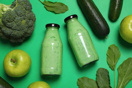 Bottles of delicious smoothie and ingredients on green background, flat lay