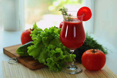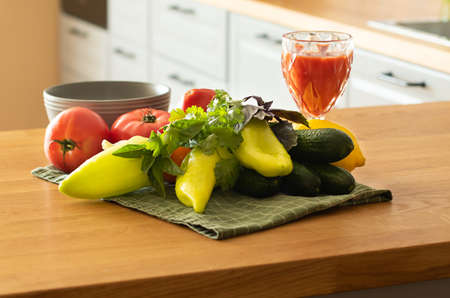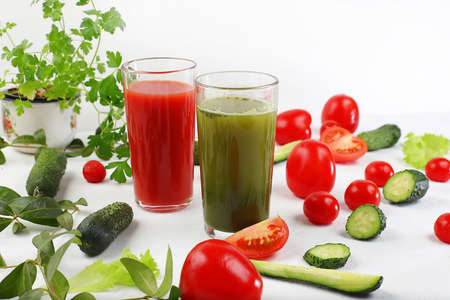 Detox diet and weight loss concept, tomato juice, cucumber smoothie and ingredients on a bright table. natural nutrition, healthy and wholesome food. Summer drinks, vitamin C, selective focus