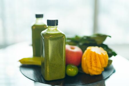 Two bottles of healthy green smoothie mixed with fruits and vegetables