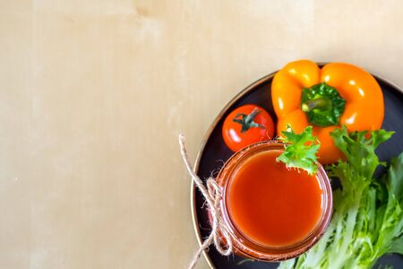 top view tomato smoothie in a glass jar with the ingredients for its preparation. Fresh tomatoe, bell peppers and lettuce on a dark plate. wooden background. copy space.
