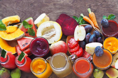 healthy eating, drinks, diet and detox concept - plastic bottles with different fruit or vegetable juices and food on wooden table