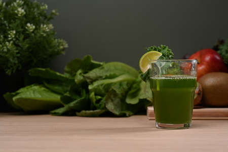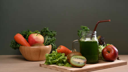Green healthy juice with organic fruits and vegetables on wooden table.