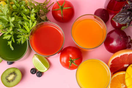 Food and drinks, healthy and useful multicolored vegetable juices and smoothies with ingredients in glass bottles, set on gray background, top view