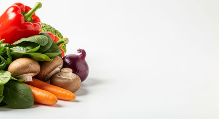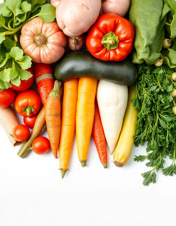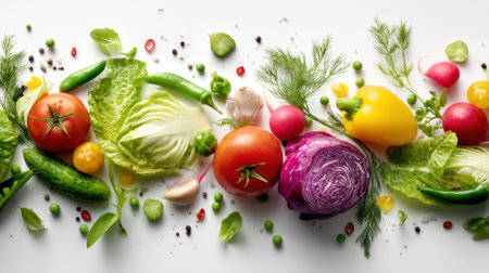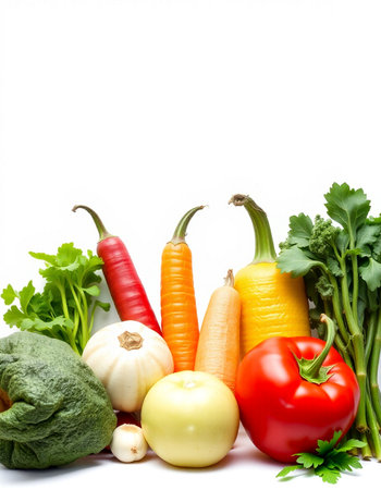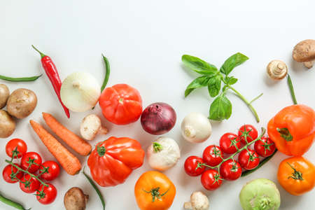Composition with variety of raw organic vegetables on white background. Balanced diet