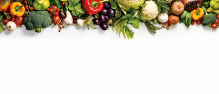 top view of colorful assorted fresh vegetables on white background, panoramic shot