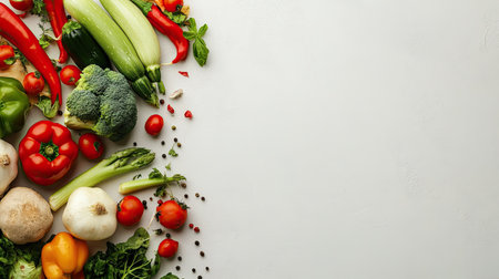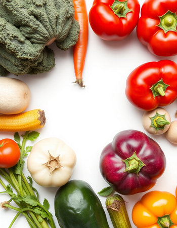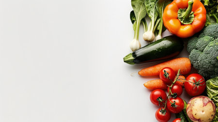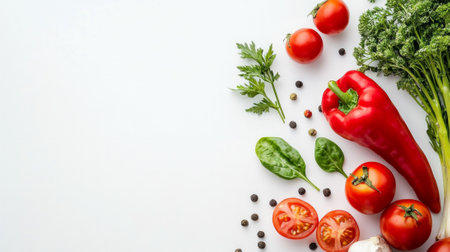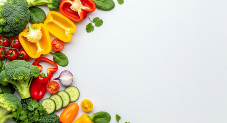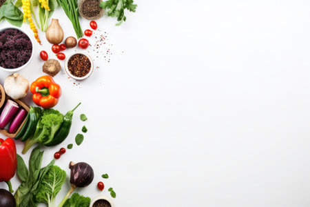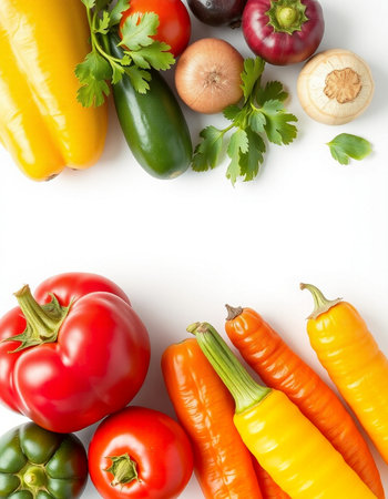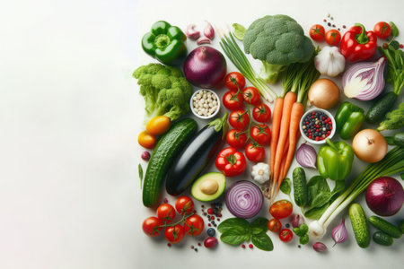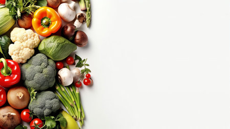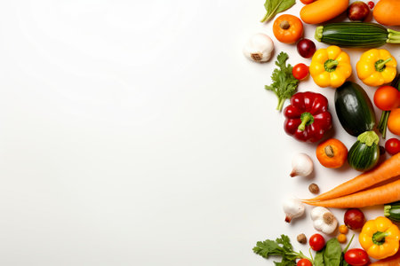 Fresh vegetables on white background with copy space. Top view, flat lay