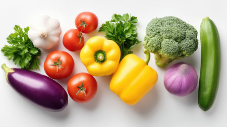 Fresh vegetables isolated on white background. Healthy eating concept. Top view.