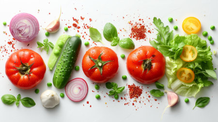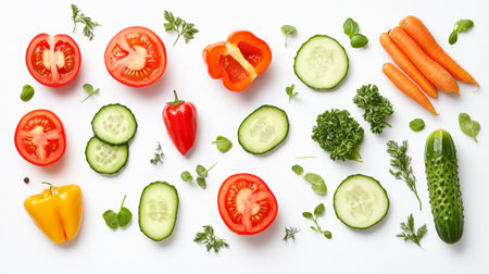Creative layout pattern made of tomato slice, onion, cucumber, asparagus, microgreen, pepperу Flat lay. Food concept. Vegetables isolated on white background. Copy space