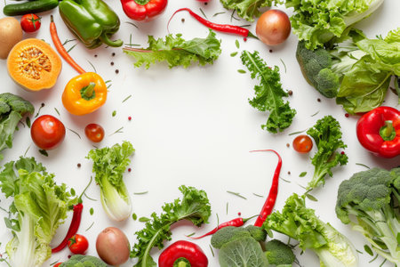 Food background border frame of colorful fresh produce raw vegetables, cucumber purple cabbage spinach tomatoes paprika onion broccoli herb, plenty of copy-space. Domestic kitchen. Vegetarian food.