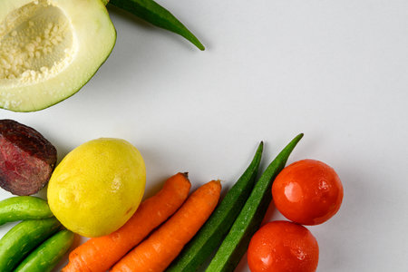 Arrangement of fresh vegetables, including avocado, lemon, carrot, and more, placed against a clean white background, emphasizing health, nutrition, and freshness in a visually simplistic style.