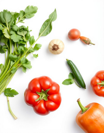 Close-up of half yellow bell pepper, red tomato and dill on white background with copy space.