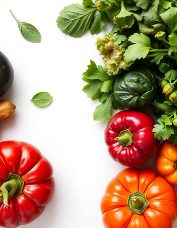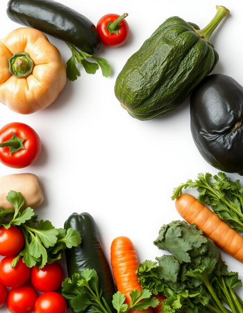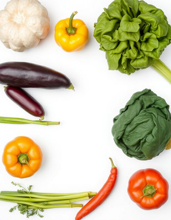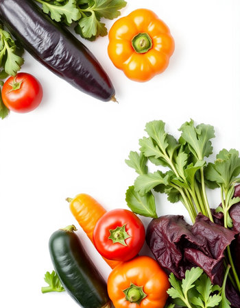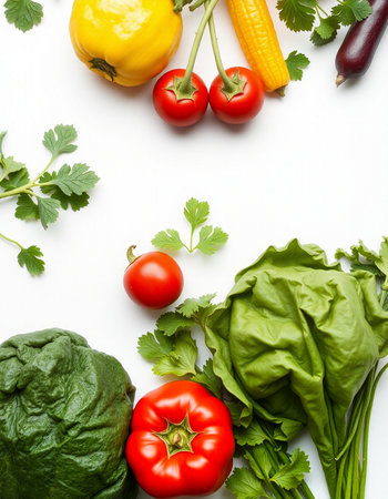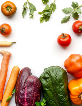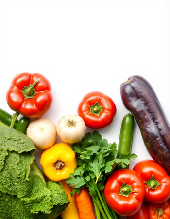 Fresh vegetables on white background. Top view with copy space. Flat lay