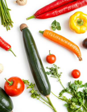 Creative presentation of seasonal summer vegetables with tomatoes, zucchini, red pepper and fresh basil. On background to include text.