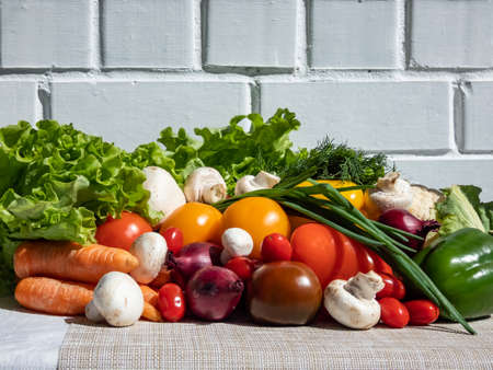 A pile of fresh, healthy and colorful vegetables in bright sunlight with white brick wall in background. Tomatoes, onions, carrots, peppers, cauliflower, salad, dill and champignons on table