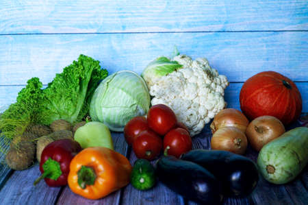 Composition of various raw vegetables on a blue background. A conceptual image on the topic of vegetarianism.