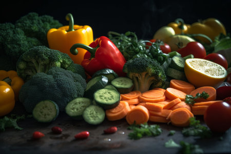 Close-up of broccoli and bell pepper, slices of cucumber, and champignons on a black background, close-up, beautiful concept of healthy eating