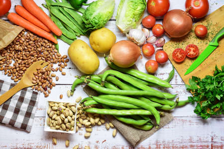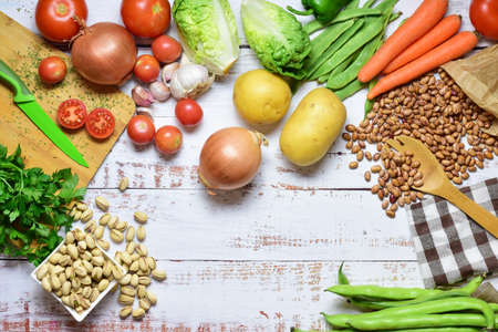 Vegetables and legumes on a white wooden background. Top view.