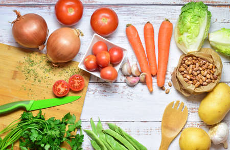 ingredients prepared for a healthy meal, kidney bean, kidney bean, onion, garlic, tomato, pepper, potato, carrot