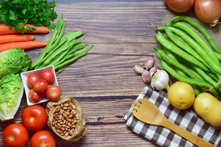 Pinto beans and vegatables on the old wooden table