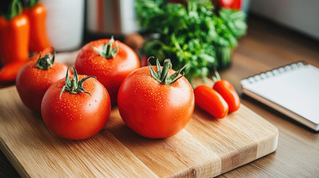 Fresh red tomatoes arranged on a wooden cutting board with herbs and a notepad, ideal for cooking, meal preparation, or food photography.