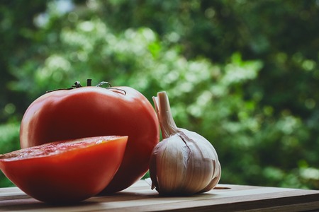 Composition of red fresh tomatoes and garlic bulb on the cutting board on the green blured background