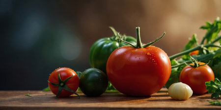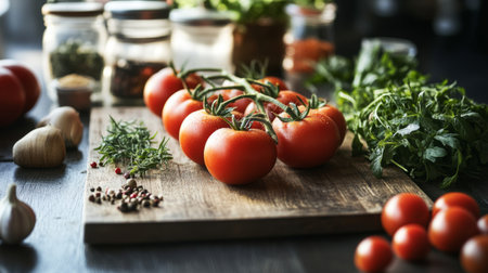 A vibrant display of ripe red tomatoes on a wooden cutting board, surrounded by fresh herbs and spices, emphasizing the freshness and color of ingredients for a delicious meal
