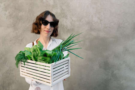 Girl is holding white wooden box full of fresh vegetables - onions, spinach, dill on background of concrete wall. Woman in sunglasses and shirt. Ideal for dietary spring salad. Copy Space