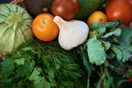 Fresh vegetables assortment with tomatoes and greens for healthy cooking