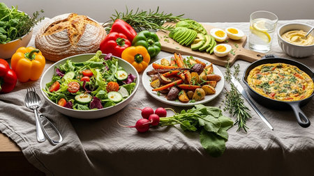 A bountiful table is laden with a fresh salad, roasted vegetables, a frittata, bread, and various other healthy food items.