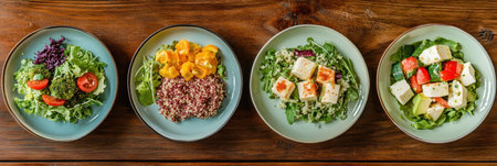Colorful plates showcase an array of plant-based dishes, including quinoa salads and tofu, perfect for a healthy meal.