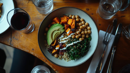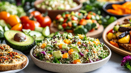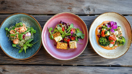 Enjoy a variety of plant-based dishes including quinoa salads, tofu, and vibrant vegetables presented beautifully on plates.