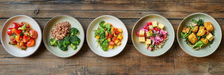 Five vibrant plant-based dishes with quinoa, tofu, and fresh veggies are beautifully arranged on a rustic wooden table for lunch.