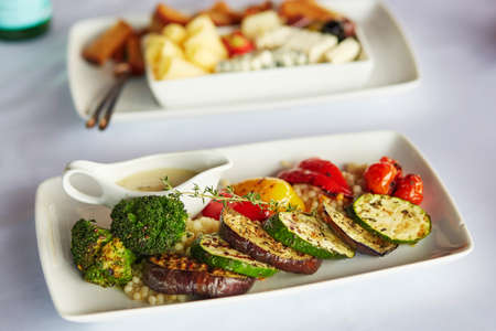 Delicious grilled zucchini, broccoli, eggplant and bell pepper served on a plate with sauce. Vegetarian food, healthy eating concept