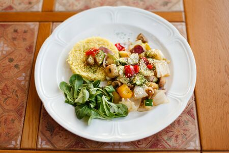 white plate with fried mushrooms and vegetables, boiled rice and fresh spinach. on a wooden table top decorated with ceramic tiles. top view