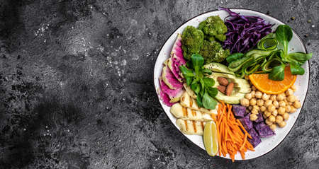 Buddha bowl salad with halloumi cheese, avocado, cucumber, chickpeas, watermelon radish, potato purple sweet. ketogenic paleo diet. Clean eating, dieting, vegan food concept. top view.