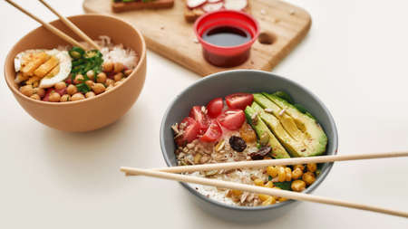 Close up of two bowls with sliced vegetables and rice, chopsticks and soy sauce isolated over white background