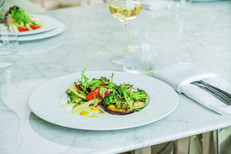 Colorful fresh vegetable salad topped with herbs and drizzled with sauce presented on a white plate at a modern dining establishment