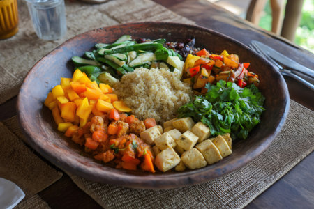 Colorful vegan Buddha bowl with tofu, quinoa and various vegetables served on a rustic wooden plate, offering a healthy and delicious meal