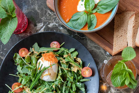 table with many salad top view. Different salads on concrete table, top view. Vegetable salad, Salad with smoked salmon, ceviche and stracciatella.