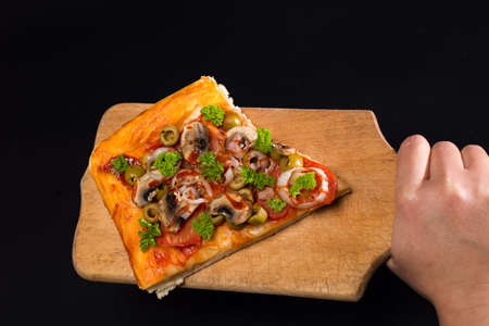 Serving slice of pizza on wooden kitchen board, isolated on black with copy space.
