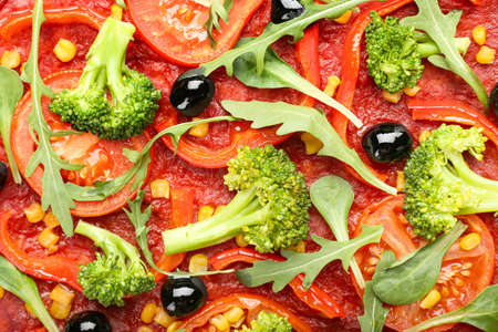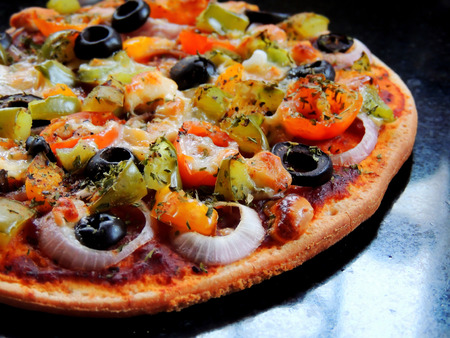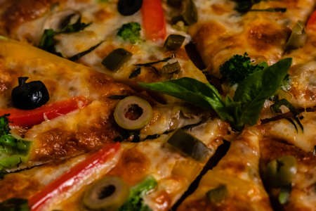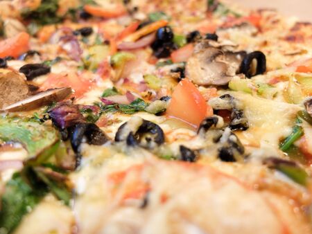 Extreme close up shot of yummy Picante Pizza loaded with vagetables