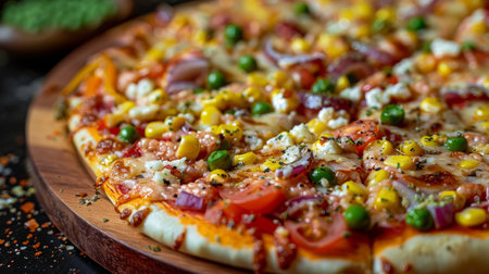 Enjoy the delicious flavors of a vegetarian pizza with fresh tomatoes, onions, and green peas on a crispy crust from a nearby pizzeria. Add basil, herbs, parsley, and spices for an extra kick