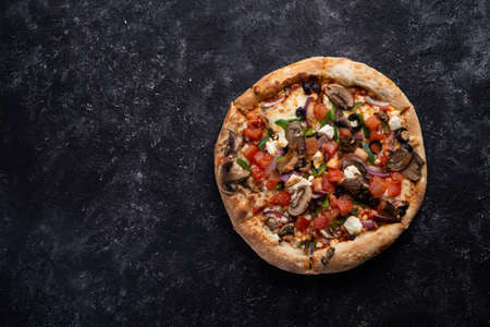 Pizza with mushrooms, olives, tomatoes and onions on a dark background